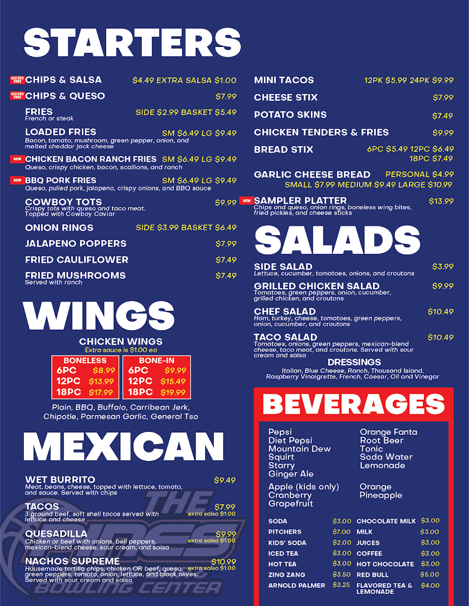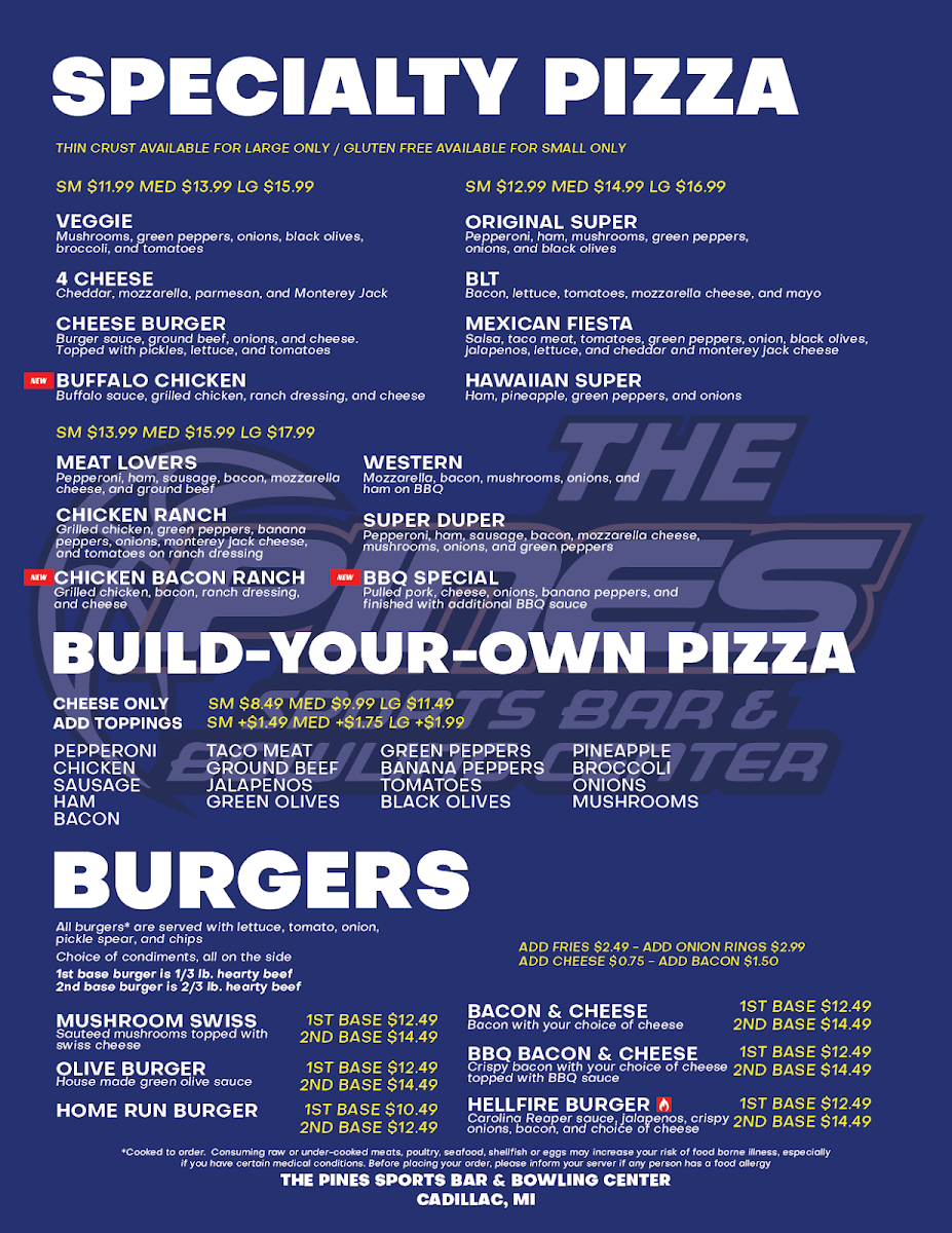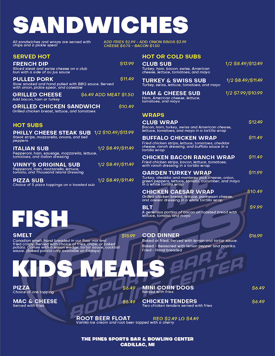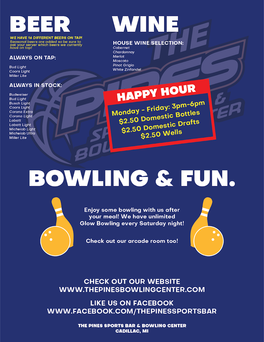 The Pines Sports Bar & Bowling Center Menu offers a laid-back yet vibrant experience where great food and fun come together. Located at 5992 M-55 in Cadillac, MI, this spot is perfect whether you’re here to bowl a few frames or catch up with friends over a delicious meal. From hearty burgers to flavorful appetizers, there’s something on the menu for everyone. You can start with some crispy wings or dive straight into their signature pizzas, all while enjoying the energetic atmosphere of the bowling lanes just steps away. Whether you're here for a quick bite or a full meal, each dish is designed to keep you satisfied as you enjoy the exciting, casual vibe of The Pines. With so many options, it’s easy to find your go-to dish - or try something new each time you visit!